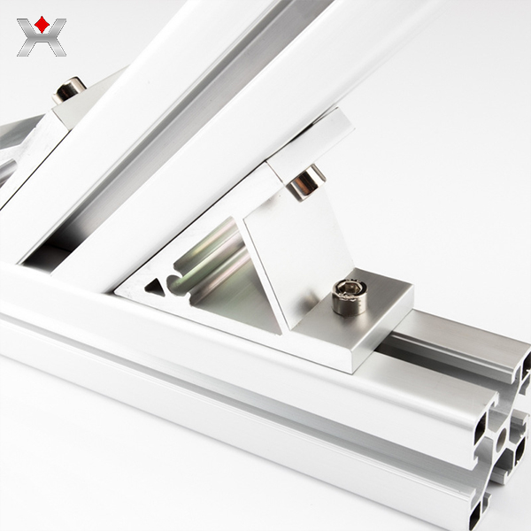 After the ends of the two industrial aluminum profiles can be cut into a 45-degree angle, they can be connected using the corner slot connector, 45 degree bracket and angle adjustment plate. If the three aluminum profile accessories are connected, they are all connected by external connection, that is, the aluminum profile accessories are fixed on the aluminum profile with bolts and nuts, which is simple and convenient.